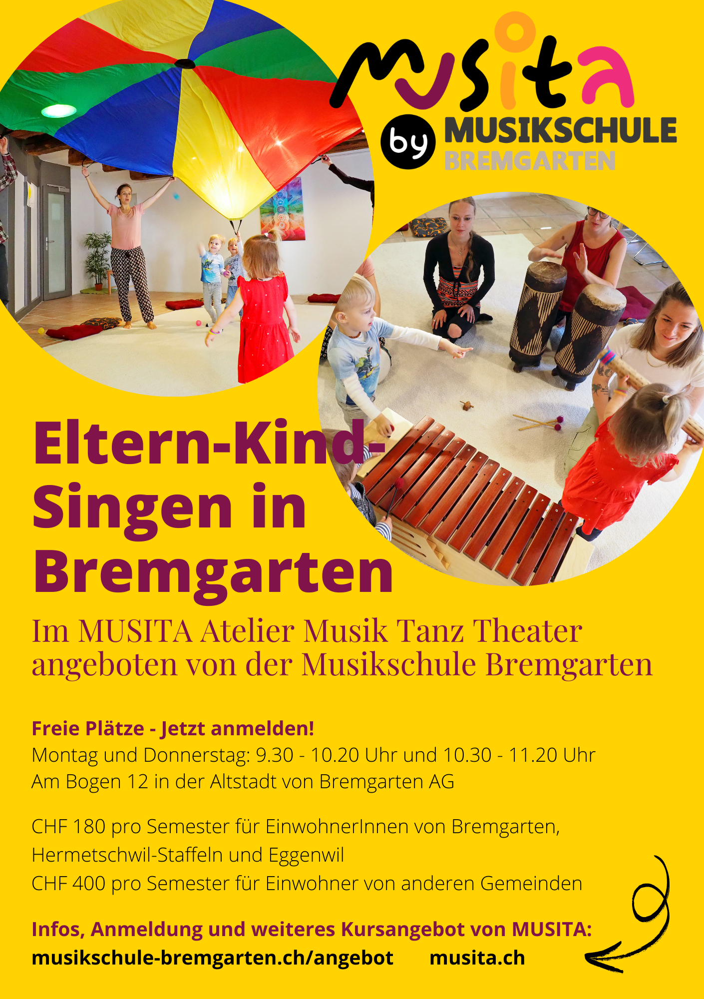 www.karussell-baden.ch/eltern-kind-singen/, info@karussell-baden.ch – Z, m - Bremgarten: Erni Nicole, Tel: 079 395 28 78, www.musita.ch, Kursinfos 2026 – P, M, D